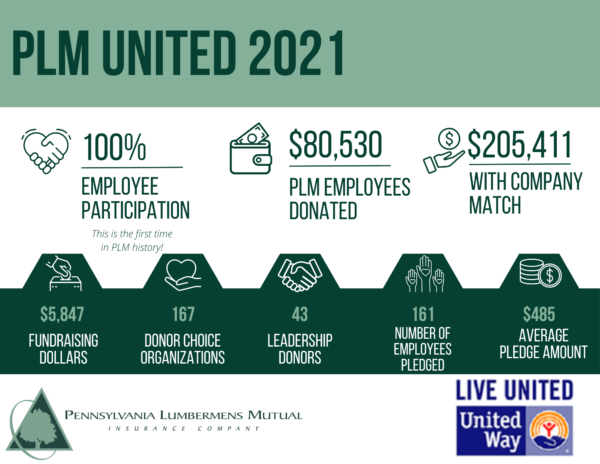 For the past 126 years, Pennsylvania Lumbermens Mutual Insurance Company’s (PLM) has served as a leader, not only in business, but in terms of charitable giving and volunteerism in the greater Philadelphia community and beyond. During our annual partnership with the United Way, our team comes together for a singular purpose – to participate in a month-long giving campaign in support of local charities and nonprofits. In 2021, our team made history with 100 percent employee participation in this campaign. In fact, PLM reached full participation just 10 days from the campaign’s launch with an average pledge of $485.